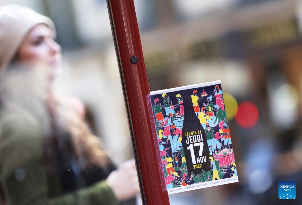 A poster of new Beaujolais Nouveau wine is seen outside a restaurant in Paris, France, Nov. 17, 2022. The new Beaujolais Nouveau, a well-known French wine, was released on Thursday. (Xinhua/Gao Jing)