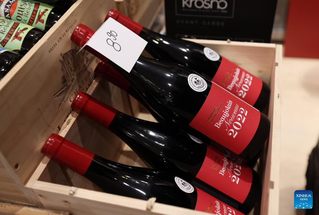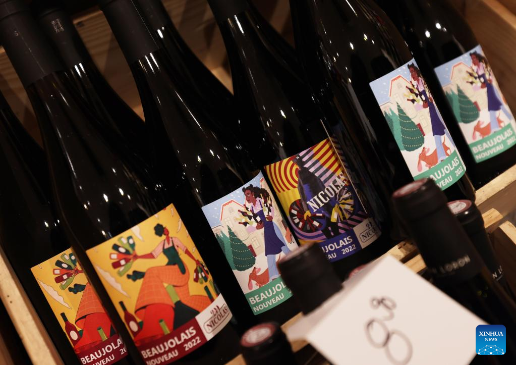 Bottles of new Beaujolais Nouveau wine are on sale at an alcohol boutique in Paris, France, Nov. 17, 2022. The new Beaujolais Nouveau, a well-known French wine, was released on Thursday. (Xinhua/Gao Jing)