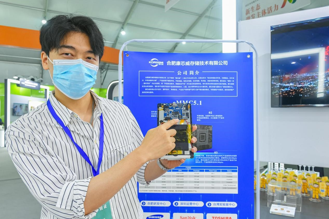 A chip developed by Hefei KONSEMI Storage Technology Co., Ltd. for consumer electronic products is displayed at an activity under the 2022 national mass entrepreneurship and innovation week in Hefei, east China's Anhui province, Sept. 16, 2022. (People's Daily Online/Yuan Bing)