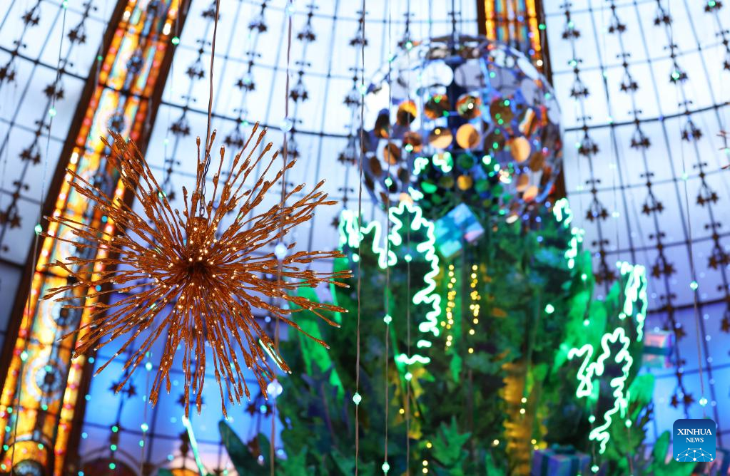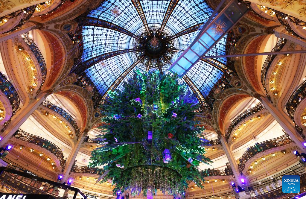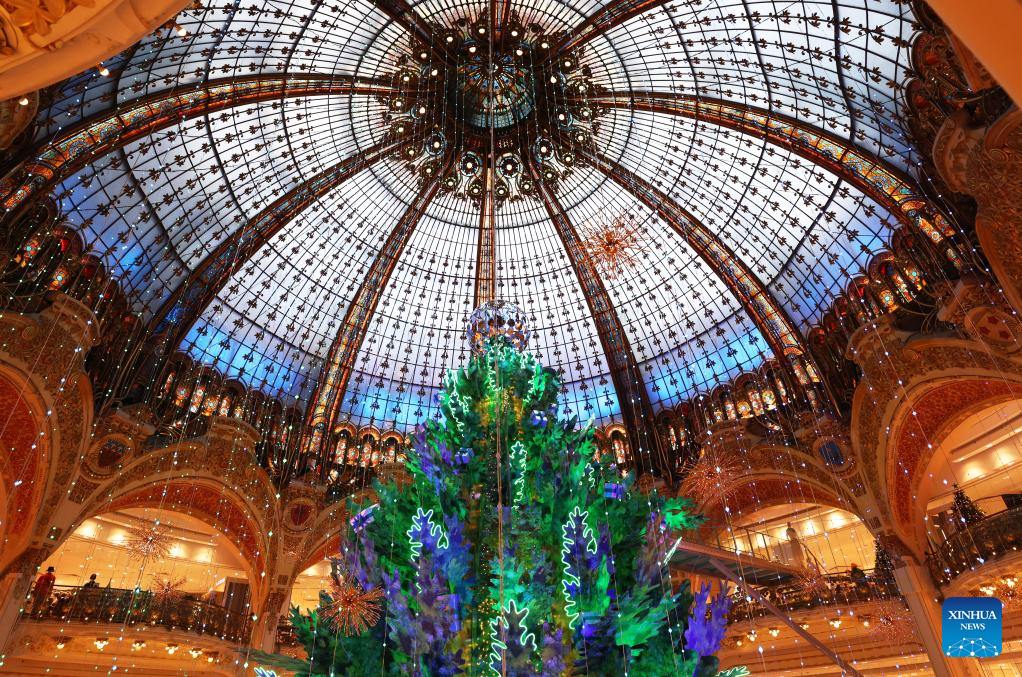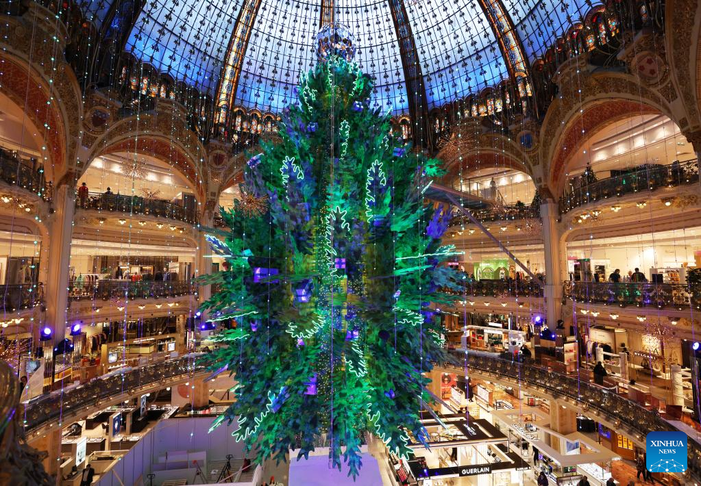 A giant Christmas tree is seen at the Galeries Lafayette department store in Paris, France, Nov. 17, 2022. (Xinhua/Gao Jing)