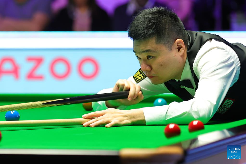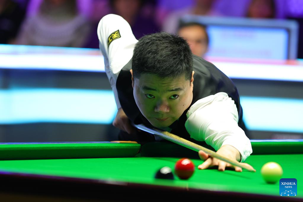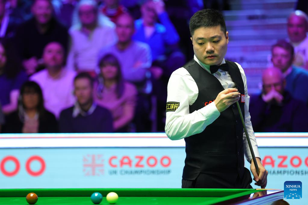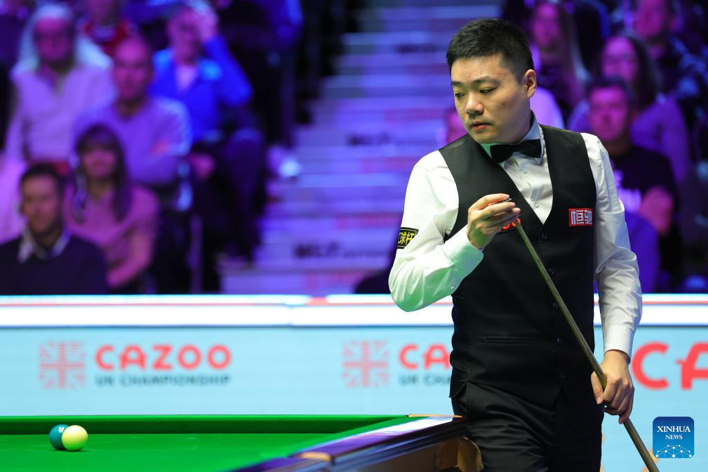 Ding Junhui of China competes during the quarter final match against Ronnie O'Sullivan of England at 2022 UK Snooker Championship in York, Britain, Nov. 18, 2022. (Photo by Zhai Zheng/Xinhua)