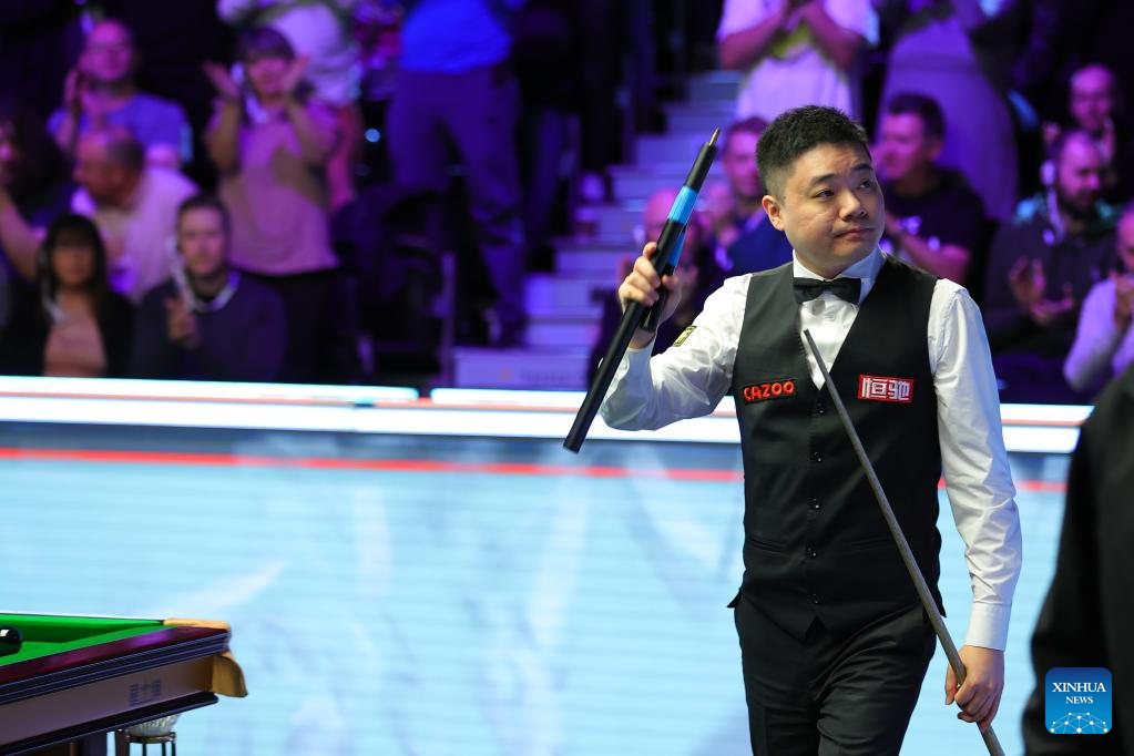 Ding Junhui of China celebrates after the quarter final match against Ronnie O'Sullivan of England at 2022 UK Snooker Championship in York, Britain, Nov. 18, 2022. (Photo by Zhai Zheng/Xinhua)