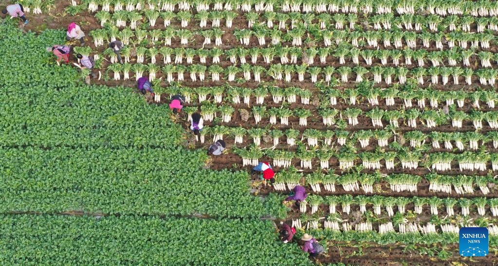 This aerial photo taken on Nov. 18, 2022 shows villagers harvesting white radishes at a vegetable base of Shahe Village of Qingshen County, southwest China's Sichuan Province. Vegetable farmers across China are busy harvesting vegetables to ensure supply in winter. (Photo by Yao Yongliang/Xinhua)
