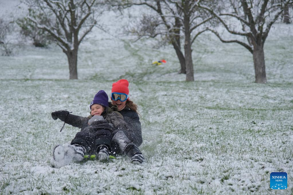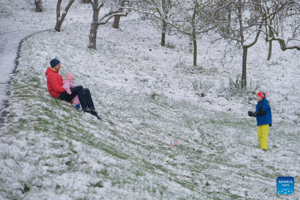 People play with snow at a park in Prague, the Czech Republic, Nov. 19, 2022. (Xinhua/Deng Yaomin)