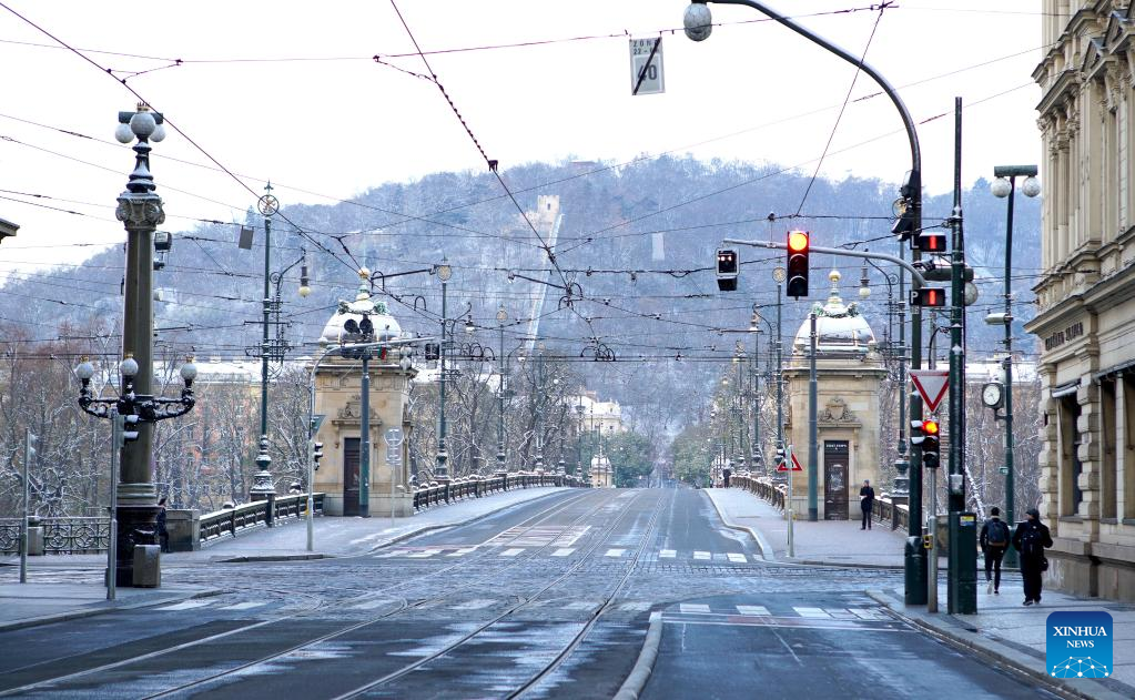 This photo shows the snow-covered Legion Bridge in Prague, the Czech Republic, Nov. 19, 2022. (Photo by Dana Kesnerova/Xinhua)
