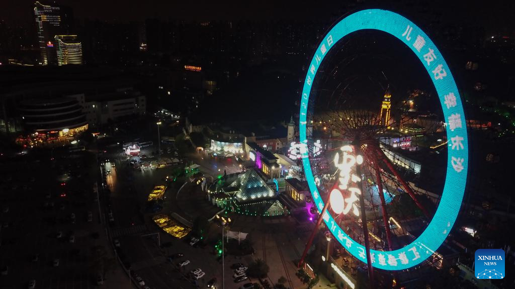 This aerial photo taken on Nov. 20, 2022 shows a ferris wheel being lit up to celebrate World Children's Day in Changsha, central China's Hunan Province. (Xinhua/Chen Zeguo)