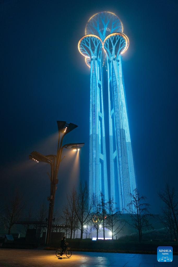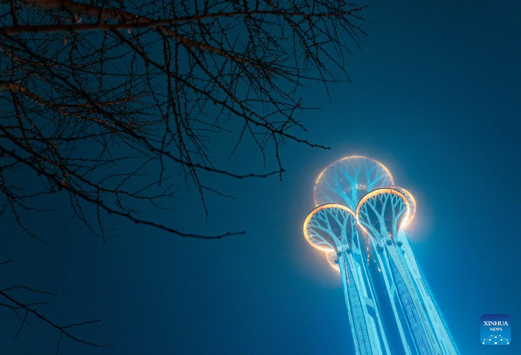 The Beijing Olympic Tower is lit up in blue to celebrate World Children's Day in Beijing, capital of China, Nov. 20, 2022. (Xinhua/Chen Zhonghao)