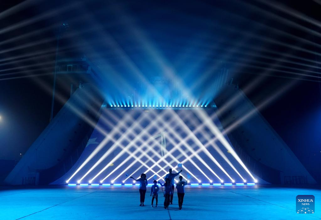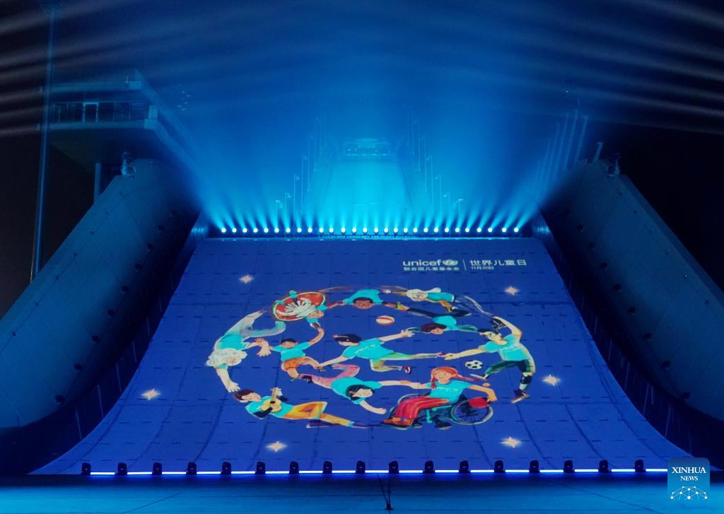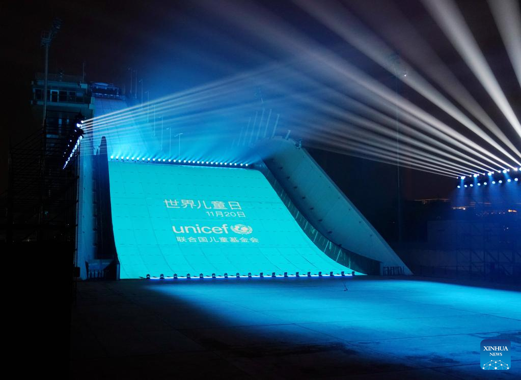 Shougang ski jumping platform is lit up to celebrate World Children's Day in Beijing, capital of China, Nov. 20, 2022. (Xinhua/Zhang Chenlin)