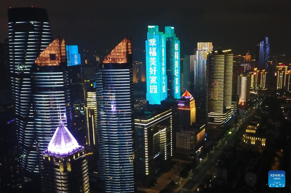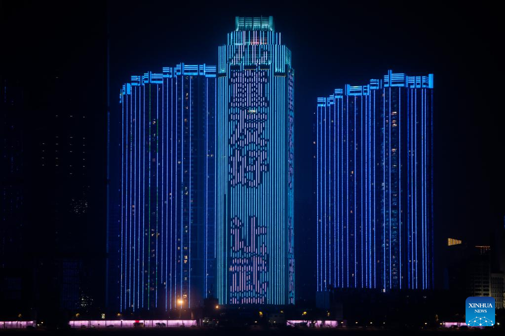Several buildings are lit up to celebrate World Children's Day in Wuhan, central China's Hubei Province, Nov. 20, 2022. (Xinhua/Wu Zhizun)