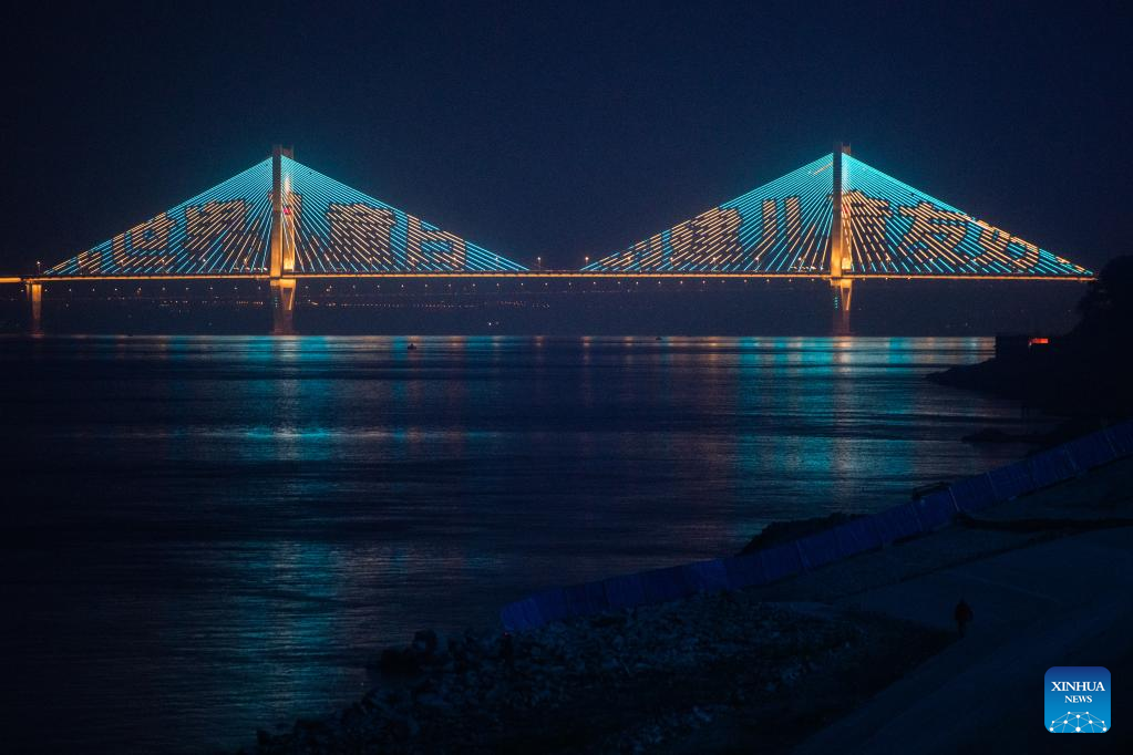 A bridge is lit up to celebrate World Children's Day in Wuhan, central China's Hubei Province, Nov. 20, 2022. (Xinhua/Wu Zhizun)