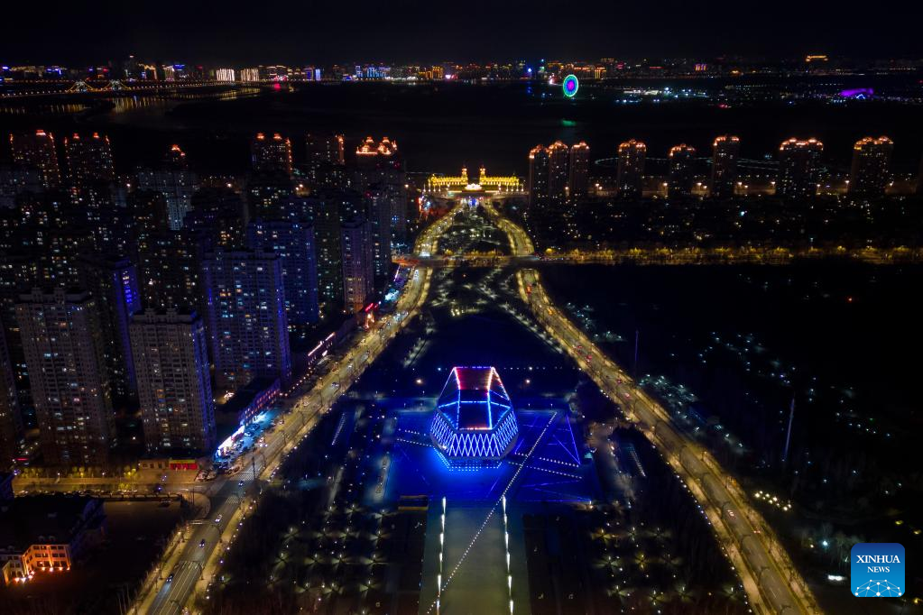 This aerial photo shows a concert hall being lit up to celebrate World Children's Day in Harbin, northeast China's Heilongjiang Province, Nov. 20, 2022. (Xinhua/Zhang Tao)