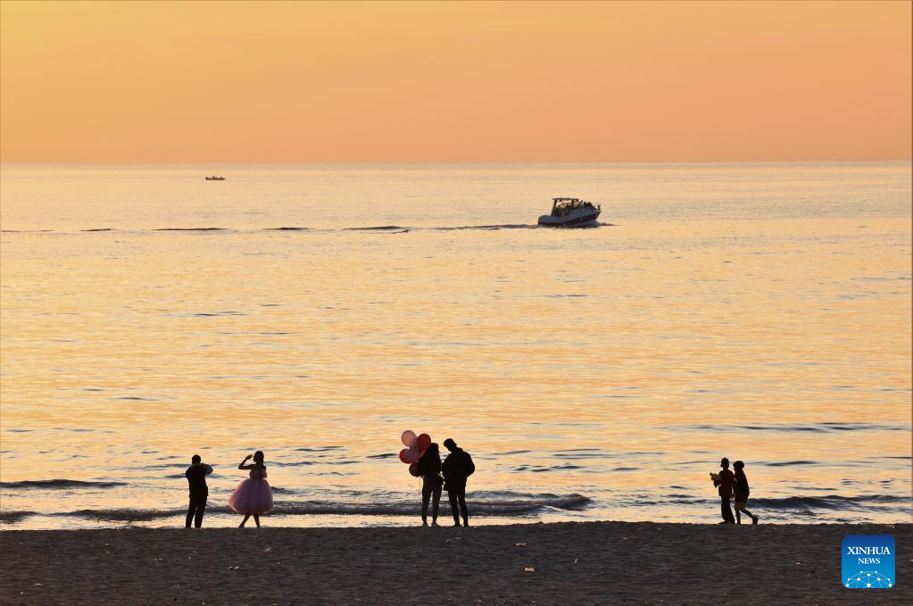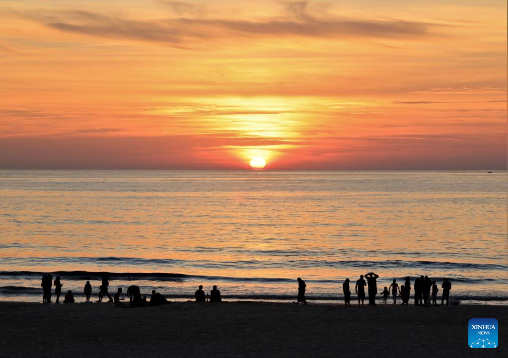 People enjoy the sunset on the beach of the Mediterranean Sea in Beirut, Lebanon, on Nov. 20, 2022. (Xinhua/Liu Zongya)