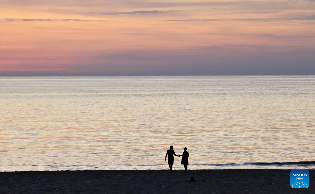 A couple enjoy themselves at sunset on the beach of the Mediterranean Sea in Beirut, Lebanon, on Nov. 20, 2022. (Xinhua/Liu Zongya)