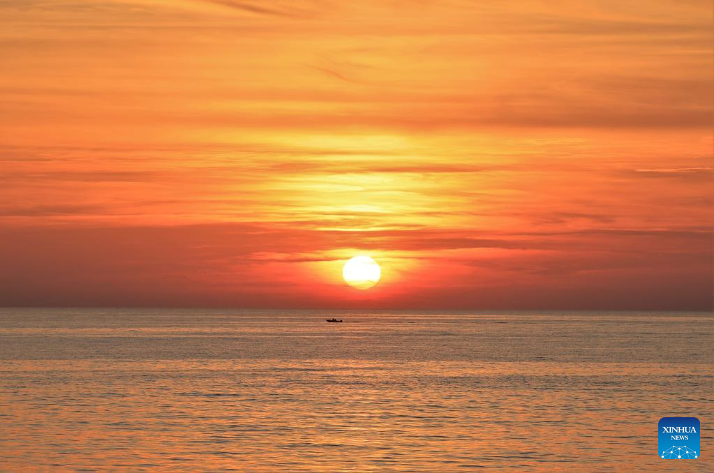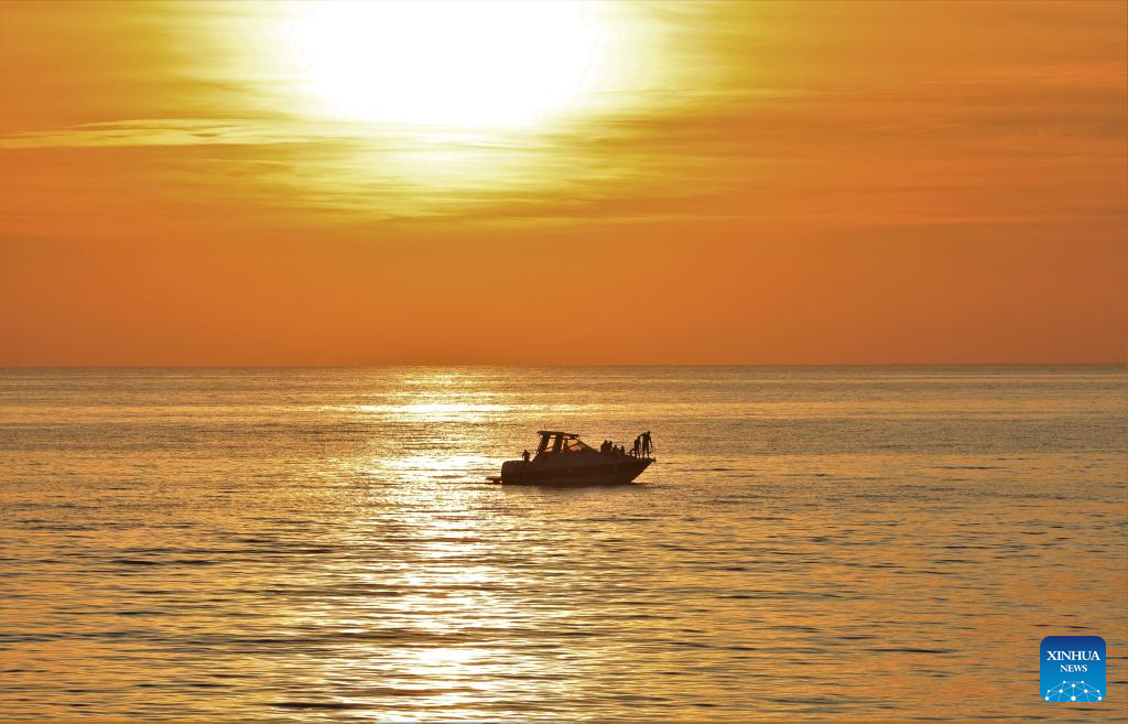 A boat is seen at sunset in the Mediterranean Sea in Beirut, Lebanon, on Nov. 20, 2022. (Xinhua/Liu Zongya)