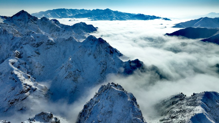 The rolling Qilian Mountains in northwest China’s Gansu Province are covered in snow, presenting a stunning spectacle. (Photo/Li Weitai)