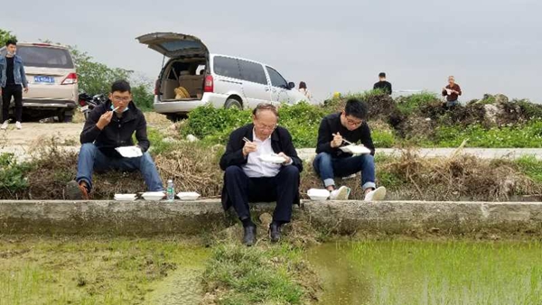 Luo Xiwen, an academician of the Chinese Academy of Engineering and expert in agricultural machinery, has lunch with his students by rice fields. (Photo/CMG Voice of China)