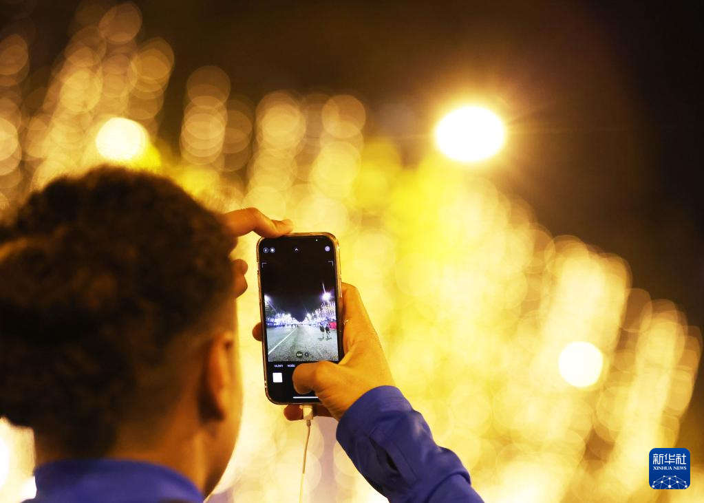 A man takes photos for the Champs-Elysees lit by Christmas holiday lights in Paris, France, Nov. 20, 2022. (Xinhua/Gao Jing)