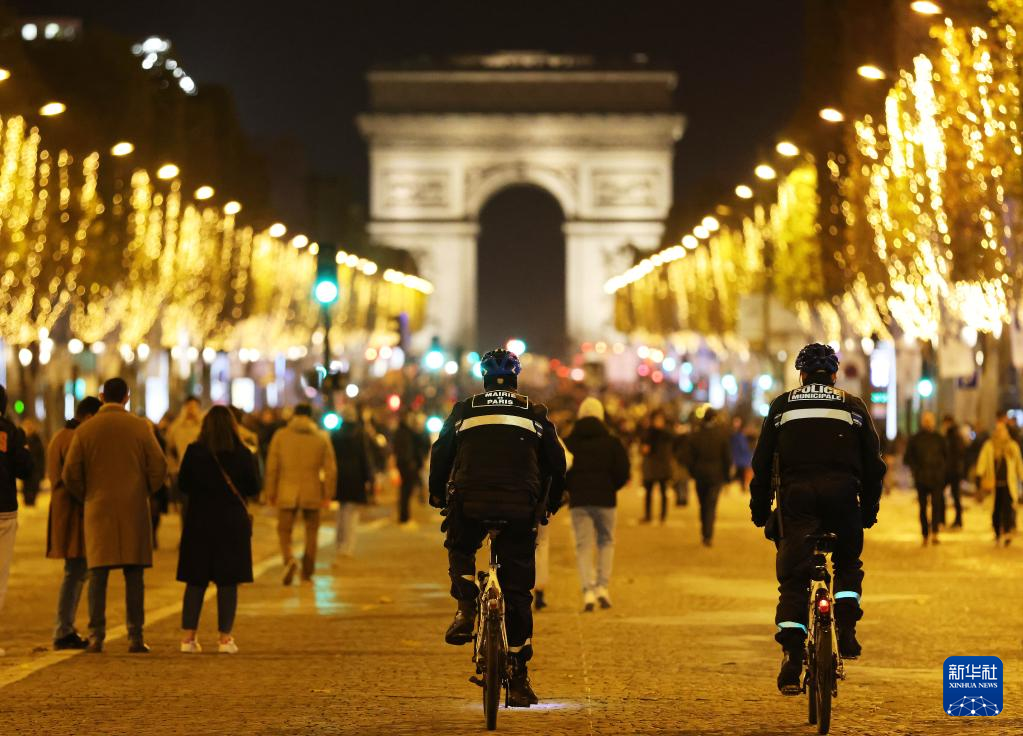 Policemen patrol at the Champs-Elysees lit by Christmas holiday lights in Paris, France, Nov. 20, 2022. (Xinhua/Gao Jing)