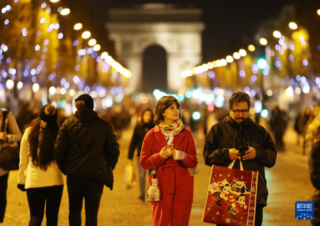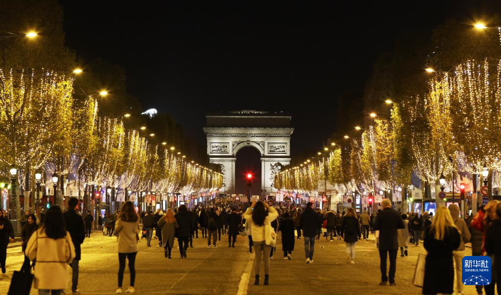 People walk at the Champs-Elysees lit by Christmas holiday lights in Paris, France, Nov. 20, 2022. (Xinhua/Gao Jing)