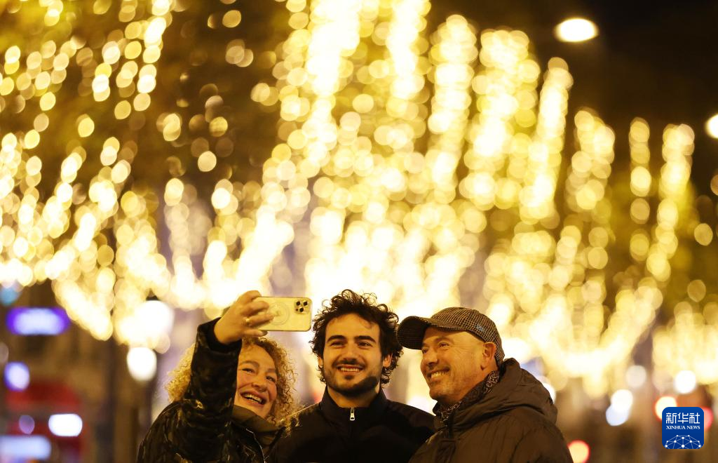 People take photos at the Champs-Elysees lit by Christmas holiday lights in Paris, France, Nov. 20, 2022. (Xinhua/Gao Jing)