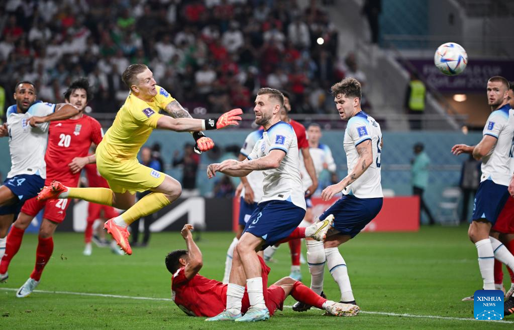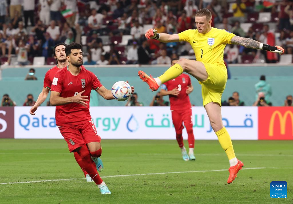 Jordan Pickford (R), goalkeeper of England, reacts after Mehdi Taremi (2nd L) of Iran scoring from a penalty during the Group B match between England and Iran at the 2022 FIFA World Cup at Khalifa International Stadium in Doha, Qatar, Nov. 21, 2022. (Xinhua/Han Yan)
