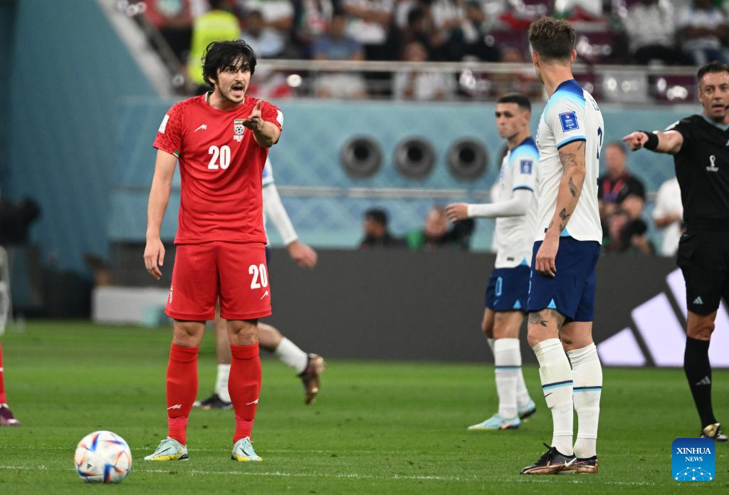 Sardar Azmoun (L) of Iran reacts during the Group B match between England and Iran at the 2022 FIFA World Cup at Khalifa International Stadium in Doha, Qatar, Nov. 21, 2022. (Xinhua/Li Ga)