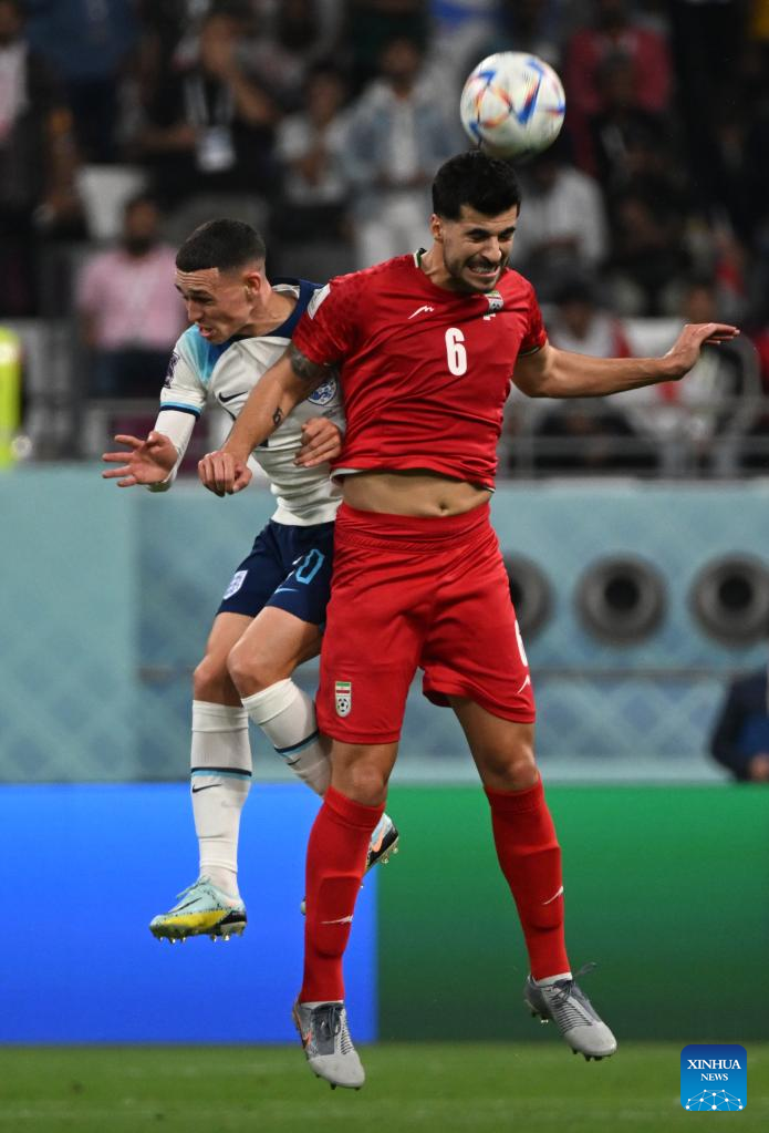 Saeid Ezatolahi (R) of Iran vies with Phil Foden of England for a header during the Group B match between England and Iran at the 2022 FIFA World Cup at Khalifa International Stadium in Doha, Qatar, Nov. 21, 2022. (Xinhua/Li Ga)