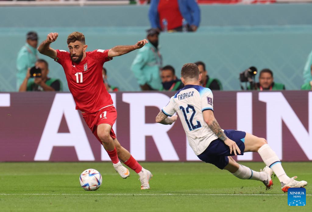 Ali Gholizadeh (L) of Iran competes during the Group B match between England and Iran at the 2022 FIFA World Cup at Khalifa International Stadium in Doha, Qatar, Nov. 21, 2022. (Xinhua/Han Yan)