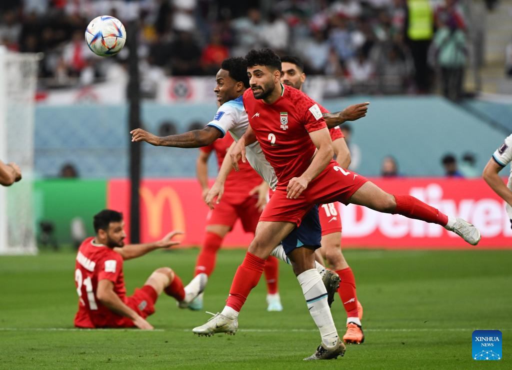 Morteza Pouraliganji (5th, L) of Iran is fouled during the Group B match between England and Iran at the 2022 FIFA World Cup at Khalifa International Stadium in Doha, Qatar, Nov. 21, 2022. (Xinhua/Meng Dingbo)