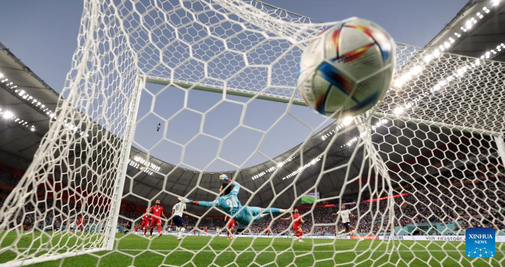 Hossein Hosseini (C), goalkeeper of Iran, fails to make a save during the Group B match between England and Iran at the 2022 FIFA World Cup at Khalifa International Stadium in Doha, Qatar, Nov. 21, 2022. (Xinhua/Han Yan)