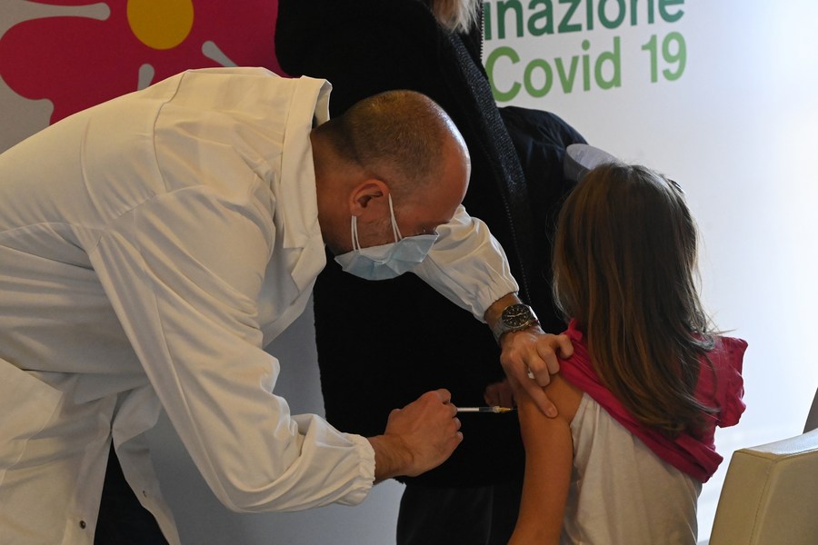 A child receives a dose of COVID-19 vaccine during an open day event at a vaccination center in Bologna, Italy, on Jan. 16, 2022. (Photo by Gianni Schicchi/Xinhua)
