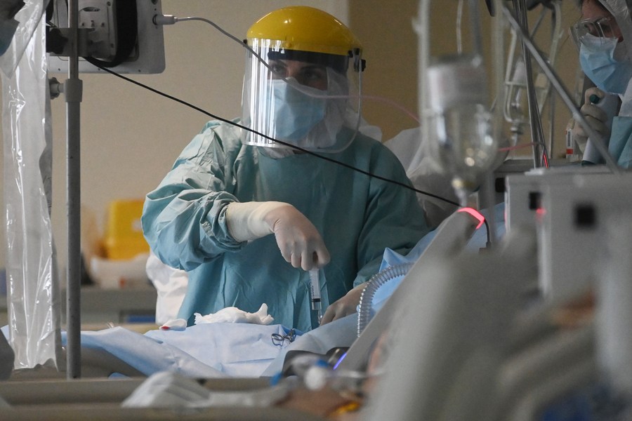 A medical staff member works in a COVID-19 intensive care unit at a hospital in Bologna, Italy, on Jan. 25, 2022. (Photo by Gianni Schicchi/Xinhua)