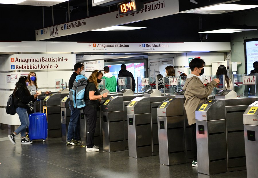 People walk through the ticket barrier at a metro station in Rome, Italy, May 1, 2022. (Xinhua/Jin Mamengni)