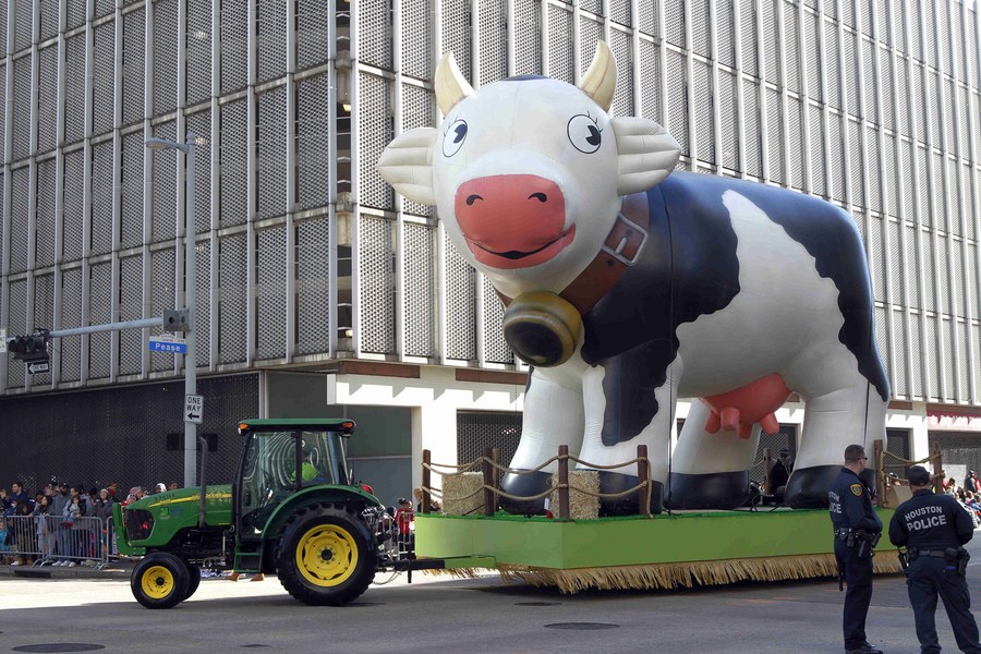 A ballon named "Hole Cow" is seen during the Thanksgiving Day Parade in Downtown Houston, Texas, the United States, on Nov. 23, 2017. (Xinhua/Song Qiong)