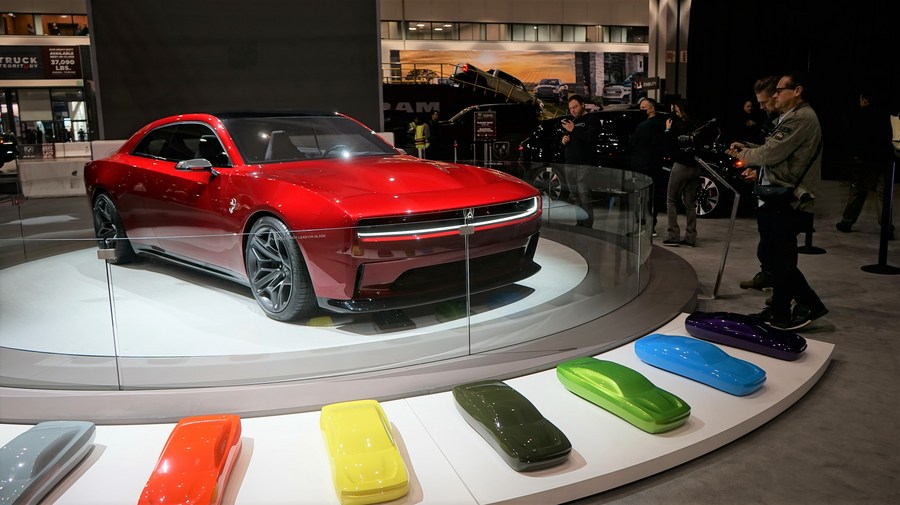 Visitors look at a car during a media preview at the 2022 Los Angeles Auto Show in Los Angeles, the United States, Nov. 17, 2022. (Photo by Zeng Hui/Xinhua)