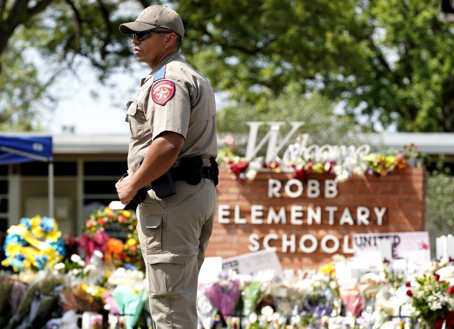 A police officer stands guard outside Robb Elementary School in the town of Uvalde, Texas, the United States, May 27, 2022. At least 19 children and two adults were killed in a shooting at the school on May 24. (Xinhua/Wu Xiaoling)