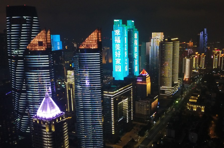 This aerial photo taken on Nov. 20, 2022 shows buildings lit up in blue to celebrate World Children's Day in Qingdao, east China's Shandong Province. (Xinhua/Li Ziheng)