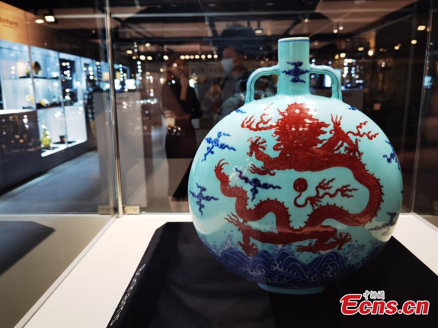 A rare imperial turquoise-ground underglaze-blue and copper-red dragon moonflask of the Emperor Qianlong (1736-1796) of Qing Dynasty is on display at Hong Kong's Bonhams, Nov. 21, 2022. (Photo: China News Service/Suo Youwei)