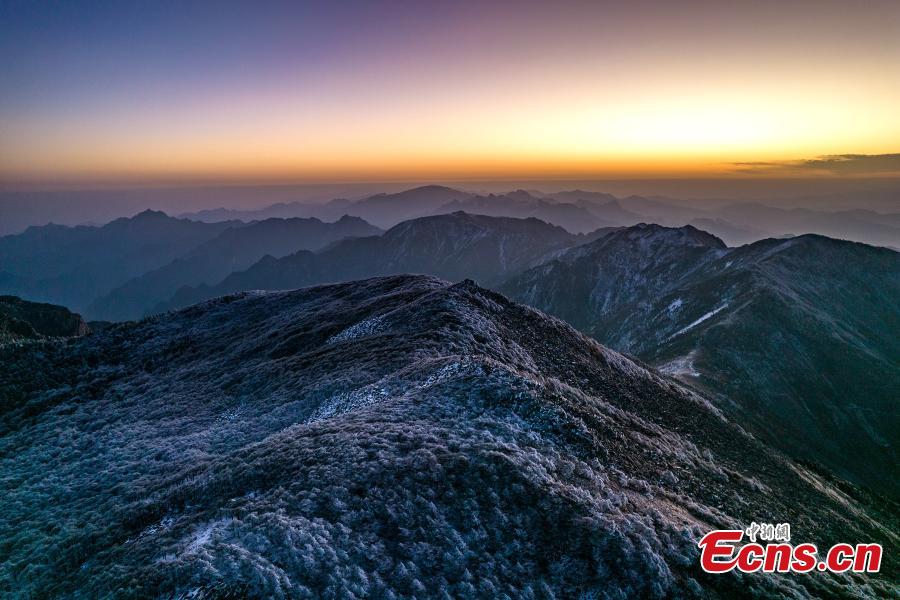 Winter sunrise shines on the mountain peak in Zhuque National Forest Park in Xi'an, northwest China's Shaanxi Province, Nov. 22, 2022, turning it into a white fairyland. (Photo: China News Service/Cheng Wenying)