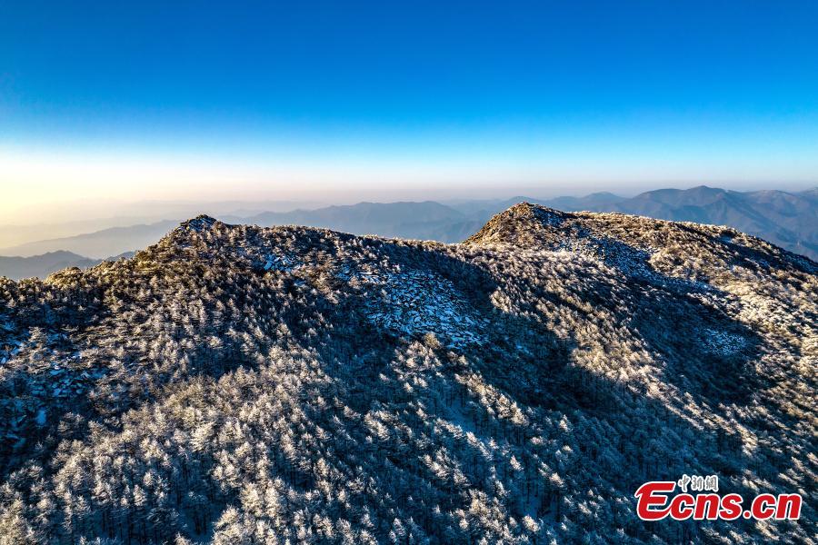 Winter sunrise shines on the mountain peak in Zhuque National Forest Park in Xi'an, northwest China's Shaanxi Province, Nov. 22, 2022, turning it into a white fairyland. (Photo: China News Service/Cheng Wenying)