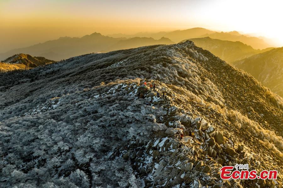 Winter sunrise shines on the mountain peak in Zhuque National Forest Park in Xi'an, northwest China's Shaanxi Province, Nov. 22, 2022, turning it into a white fairyland. (Photo: China News Service/Cheng Wenying)