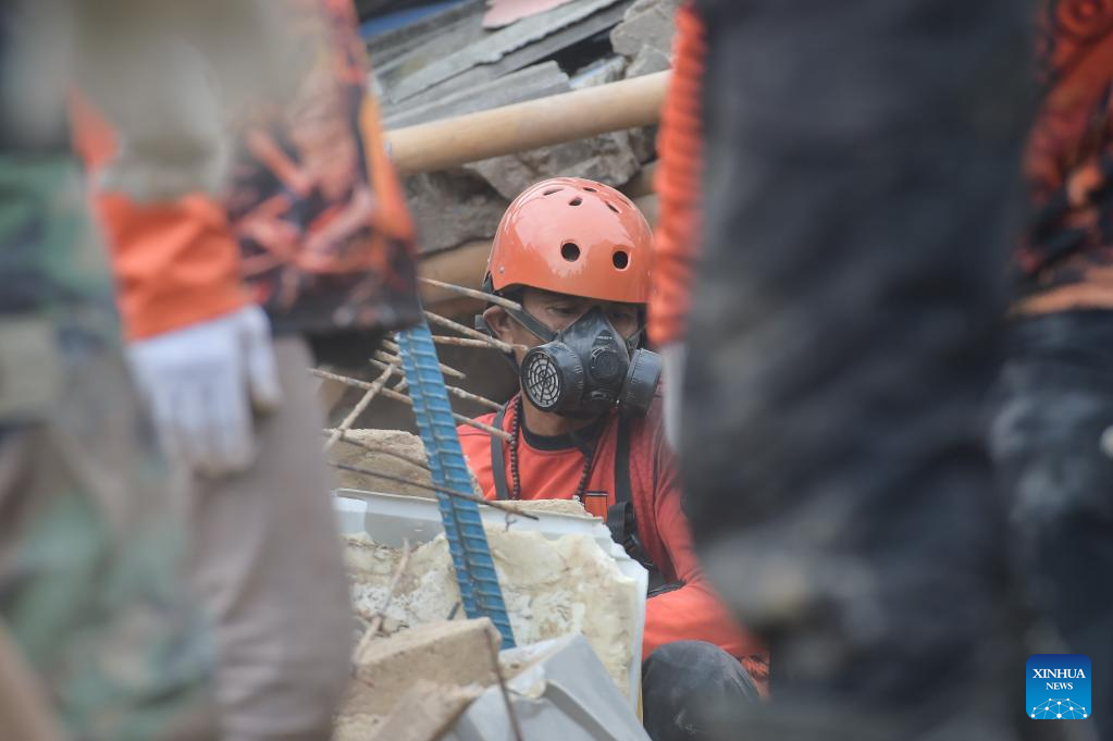 Rescuers dismantle the rubble of damaged houses to evacuate survivors after a 5.6-magnitude earthquake at Mangunkerta village in Cianjur, West Java, Indonesia, Nov. 23, 2022. (Xinhua/Veri Sanovri)