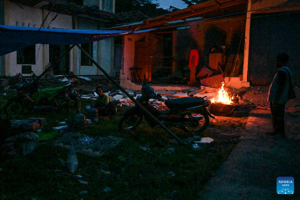 Local residents are pictured near damaged houses after a 5.6-magnitude earthquake at Mangunkerta village in Cianjur, West Java, Indonesia, Nov. 23, 2022. (Xinhua/Veri Sanovri)