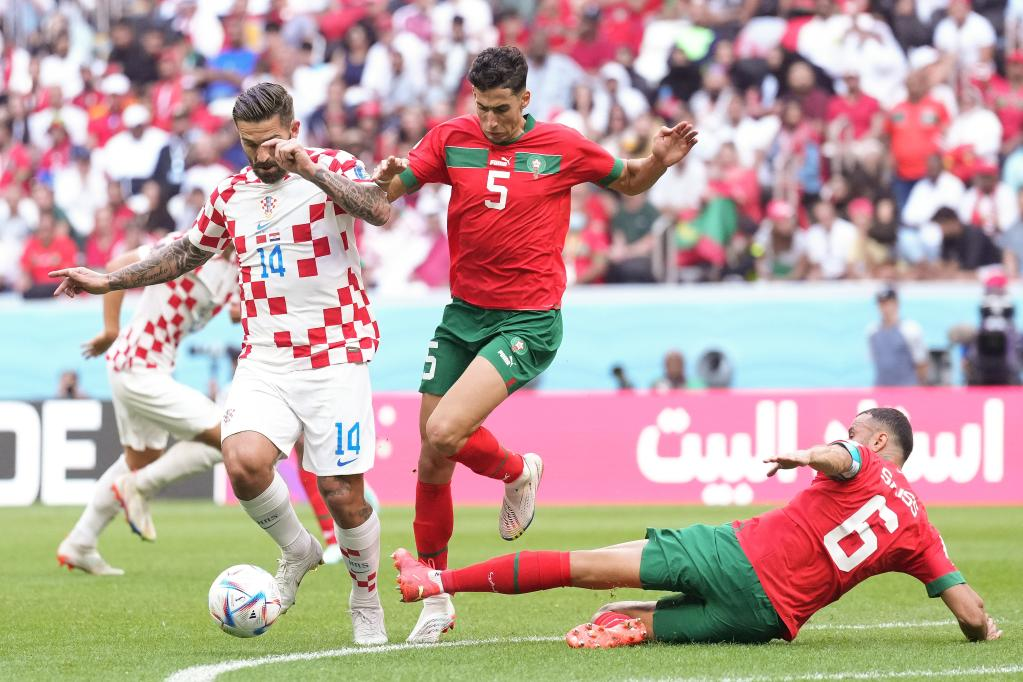 Marko Livaja (1st L) of Croatia dribbles on the defense of Nayef Aguerd (C) and Romain Saiss of Morocco during the Group F match between Morocco and Croatia at the 2022 FIFA World Cup at Al Bayt Stadium in Al Khor, Qatar, Nov. 23, 2022. (Xinhua/Zheng Huansong)