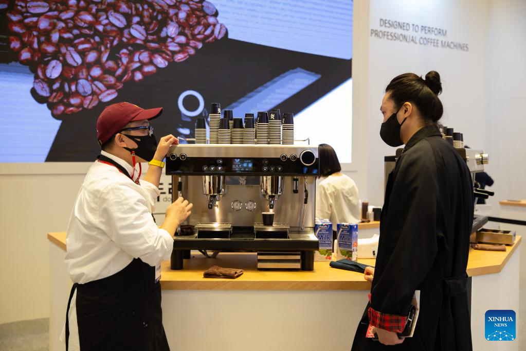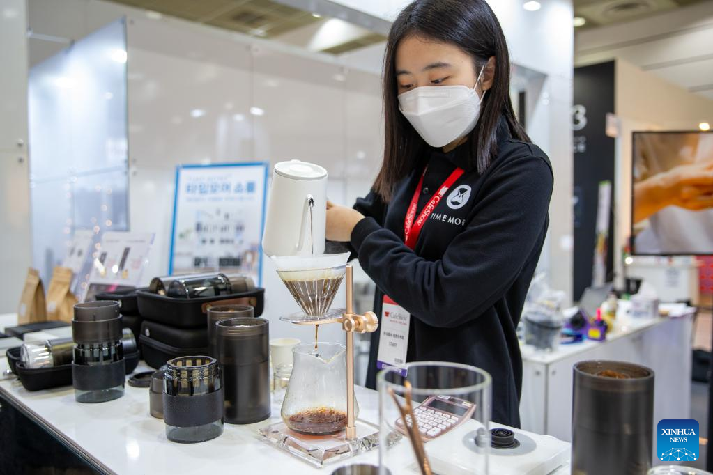 An exhibitor makes coffee during the 2022 Seoul International Cafe Show in Seoul, South Korea, Nov. 23, 2022. The 2022 Seoul International Cafe Show kicked off in Seoul on Wednesday. (Xinhua/Wang Yiliang)