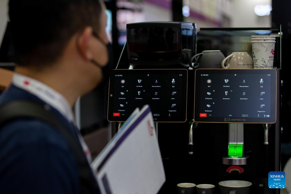 A visitor learns about products on exhibit during the 2022 Seoul International Cafe Show in Seoul, South Korea, Nov. 23, 2022. The 2022 Seoul International Cafe Show kicked off in Seoul on Wednesday. (Xinhua/Wang Yiliang)