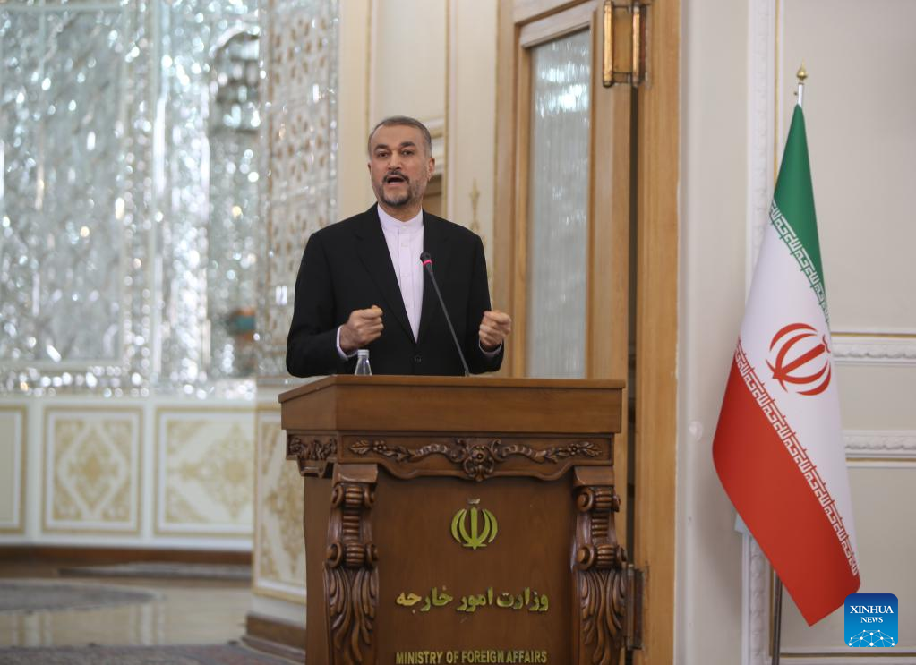 Iranian Foreign Minister Hossein Amir-Abdollahian speaks during a press conference in Tehran, Iran, on Nov. 23, 2022. Iranian Foreign Minister Hossein Amir-Abdollahian said here Wednesday that the exchange of messages between his country and the United States for the removal of anti-Iran sanctions still continues. (Xinhua/Gao Wencheng)
