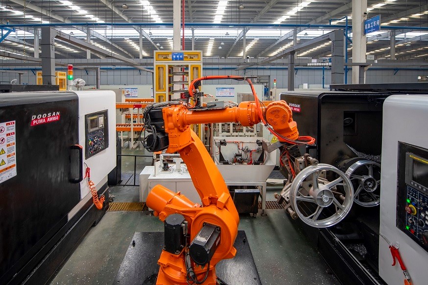 Motorcycle wheels are manufactured by a robotic arm in a digital workshop of a Zhejiang-based company, March 2022. (People's Daily Online/Hu Xiaofei)