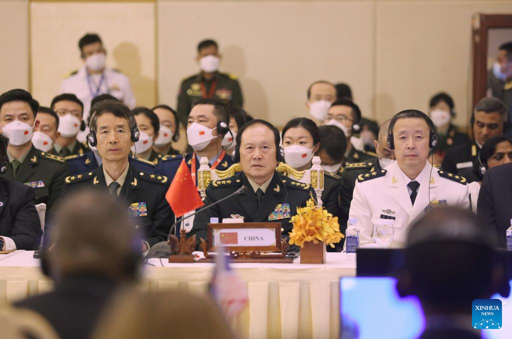 Chinese State Councilor and Defense Minister Wei Fenghe (C) delivers a speech at the 9th Association of Southeast Asian Nations (ASEAN) Defense Ministers' Meeting Plus in Siem Reap, Cambodia, Nov. 23, 2022. (Photo by Li Xiaowei/Xinhua)