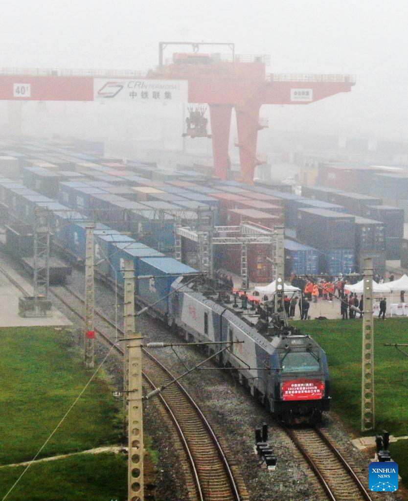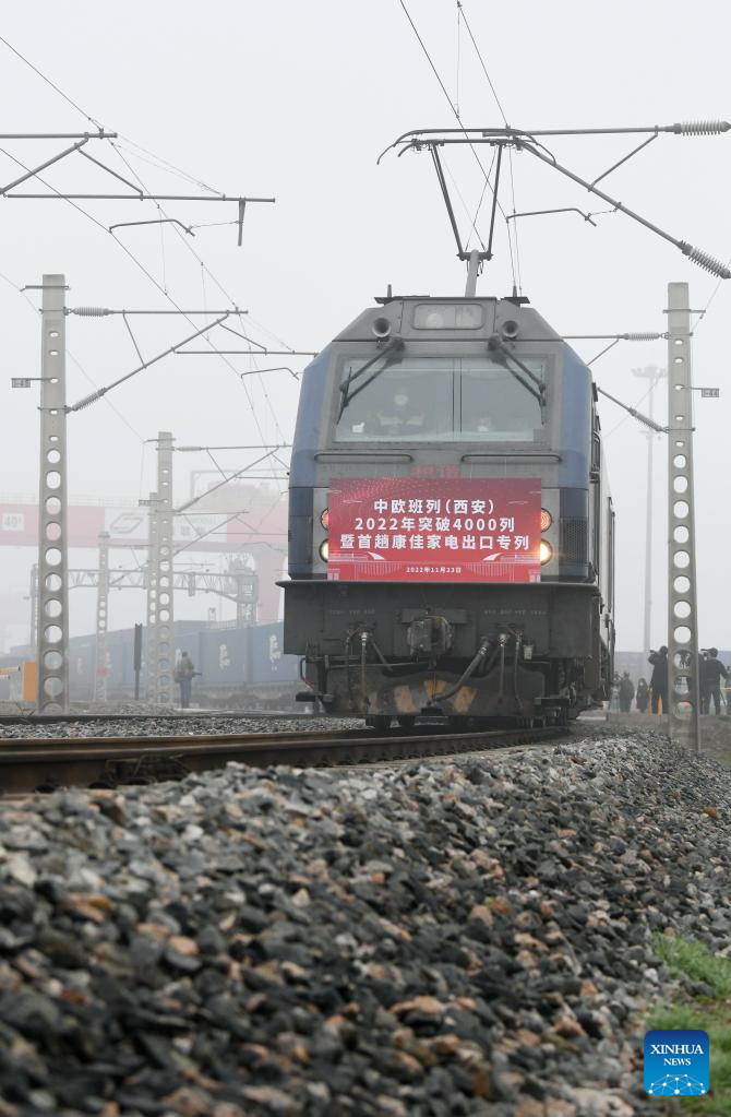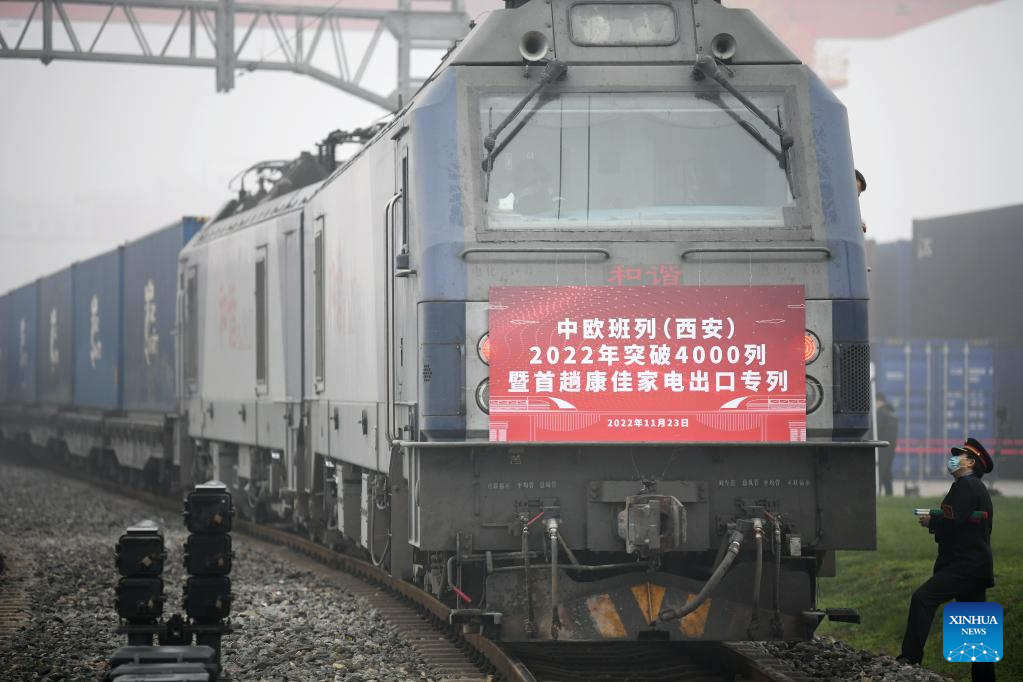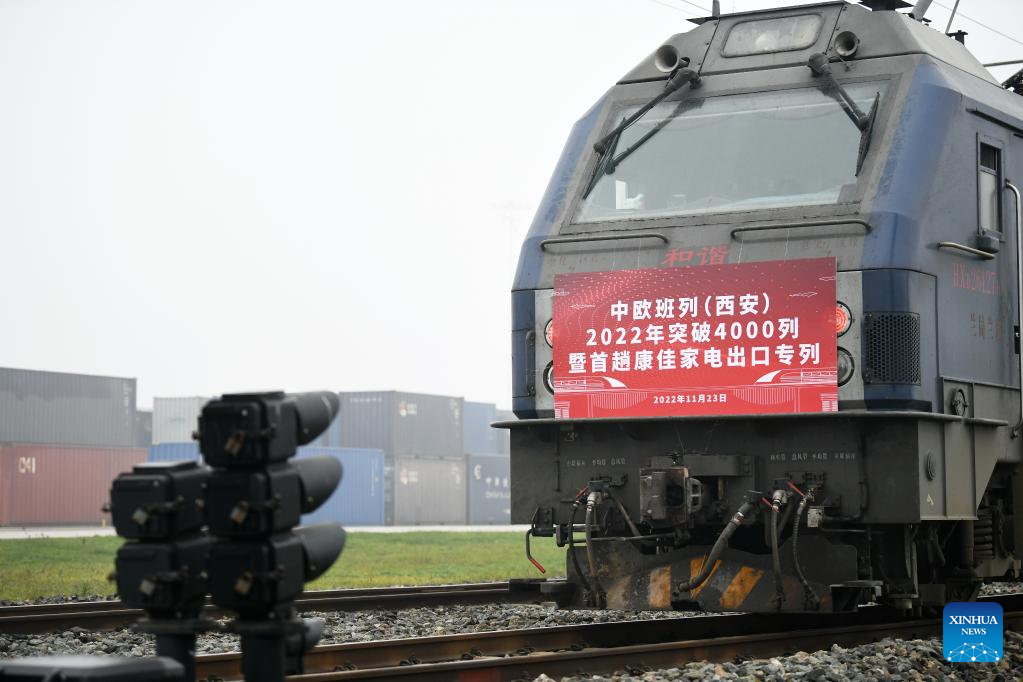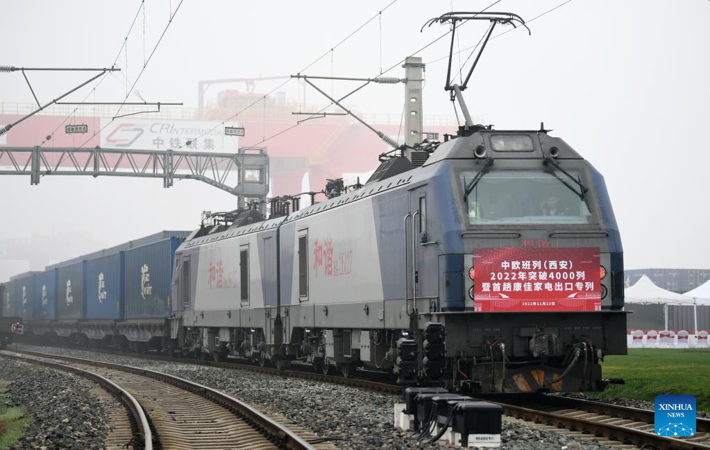 Train No. X8151, a China-Europe freight train, leaves from Xi'an International Port in Xi'an, northwest China's Shaanxi Province, Nov. 23, 2022. The train No. X8151, fully loaded with home appliances products, departed from Xi'an to Europe on Wednesday, marking the 4,000th trip of China-Europe freight train made from Shaanxi in 2022. (Xinhua/Li Yibo)